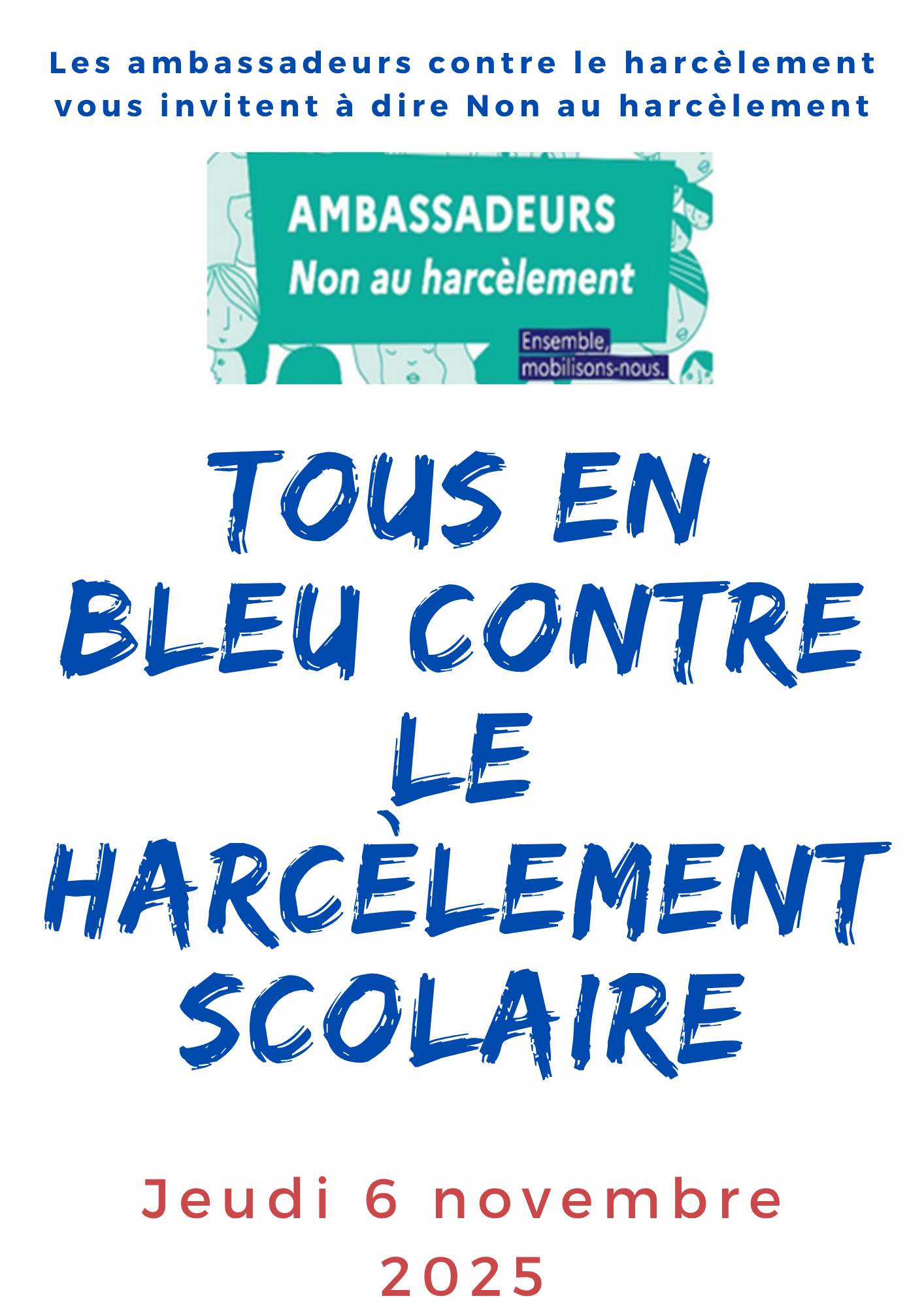 - Dress Code « Tous en bleu contre le harcèlement » le JEUDI 6 NOVEMBRE. Tout le monde est invité à porter un vêtement et /ou un accessoire bleu pour dire NON au harcèlement. Ce même jour, la chorale interprétera une chanson à 12h45 en salle polyvalente