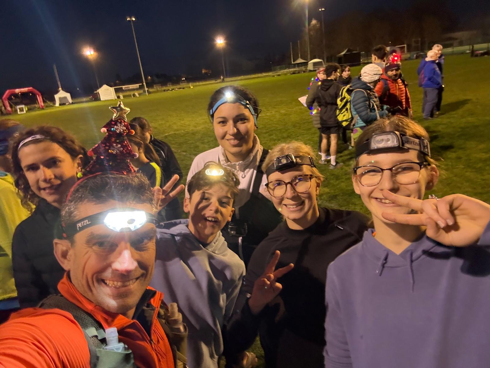 Pour cet événement, l'esprit était plus a la fête qu'à la compèt. Un vrai bon moment de partage où chaque équipe ( presque) a couru 🏃🏻avec un adulte (parent ou prof), la météo était clémente, les sourire très grands 😁 et plein d'étoiles dans les yeux🤩. Bravo a nos 17 coureurs en herbes qui ont parcourus 4 km en forêt de Seillon 🌲 illuminé par quelques 600 lumières venus du département. Nous avons croisés des rennes , un requin des bananes, le père Noël. Le réconfort d'un bon chocolat chaud.