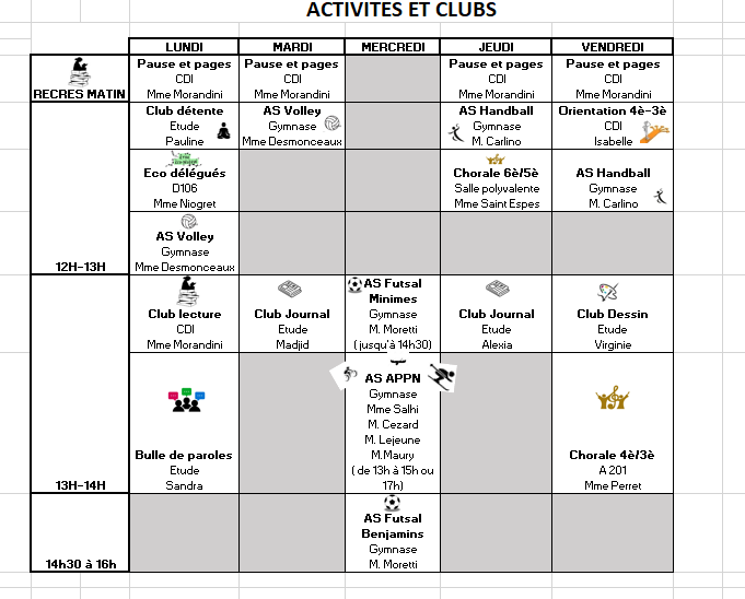 Voici le planning des clubs organisés sur l'année 2025-2026