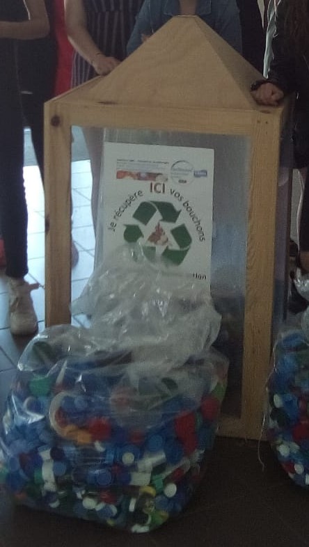 Le conteneur à bouchons mis dans le hall sert à récupérer les bouchons en plastique pour les envoyer à une association. Ce conteneur a été fabriqué par les élèves du Parcours Adapté.